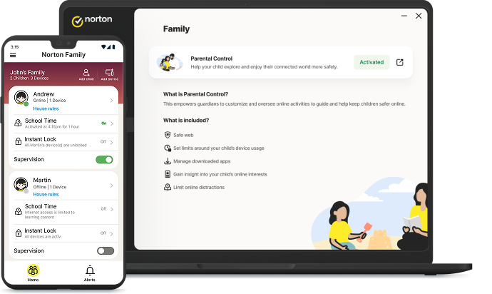 ‡ Parental Control can only be installed and used on a child’s Windows™ PC, iOS and Android™ device but not all features are available on all platforms. Parents can monitor and manage their child’s activities from any device – Windows PC (excluding Windows in S mode), Mac, iOS and Android – via our mobile apps, or by signing into their account at my.Norton.com and selecting Parental Control via any browser. Mobile app must be downloaded separately. The iOS app is available in all except these countries.